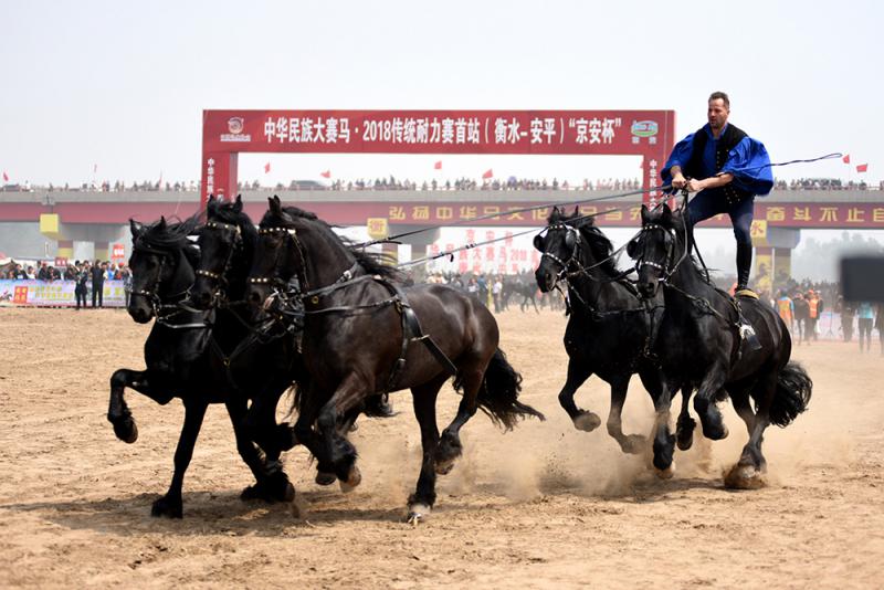 26日,中華民族大賽馬.2018傳統耐力賽首站在河北省衡水市安平縣開賽,來自北京、天津、河北、黑龍江等地的159對人馬組合展開角逐,在比賽間隙更有匈牙利馴馬師進行馬術表演。 (新華社)