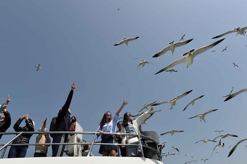圖:遊客在被譽為「海上仙山」的山東省長島縣萬鳥島乘遊船觀賞海鷗 資料圖片