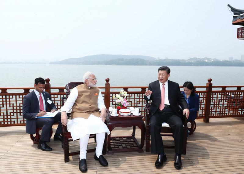 圖:4月27日和28日,國家主席習近平在武漢東湖賓館同印度總理莫迪舉行非正式會晤。這是28日,習近平同莫迪交談 新華社