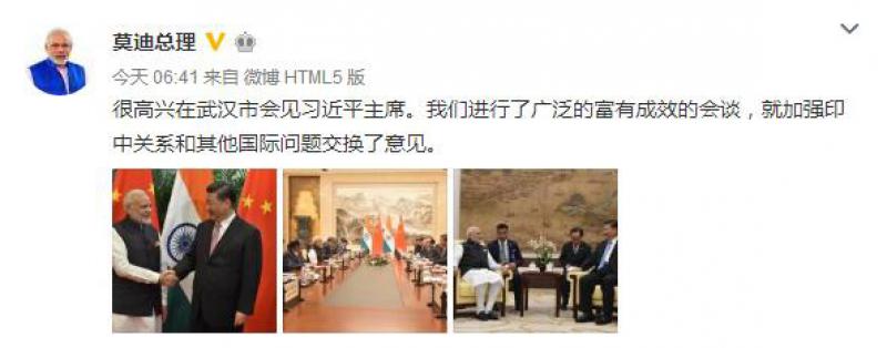 國家主席習近平27日在武漢會見來華進行非正式會晤的印度總理莫迪,並共同參觀湖北省博物館精品文物展。28日,莫迪在微博上發文稱:「很高興在武漢市會見習近平主席。我們進行了廣泛的富有成效的會談,就加強印中關係和其他國際問題交換了意見。」