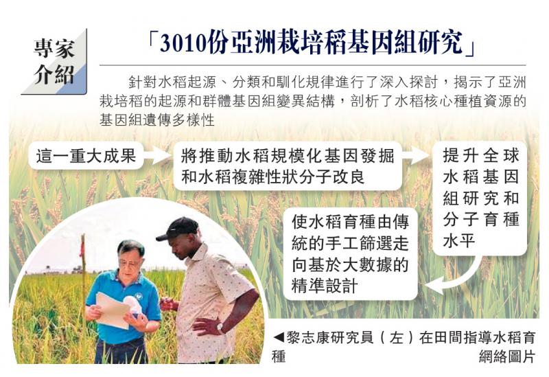 【大公報訊】據中國經濟網報道:在4月26日凌晨1點,國際頂級期刊《自然》雜誌在線長文報道了「3010份亞洲栽培稻基因組研究」成果。該研究由中國農業科學院作物科學研究所牽頭,聯合國際水稻研究所、上海交通大學、深圳農業基因組研究所、美國亞利桑那大學等16家單位共同完成。這是國內外水稻研究專家大協作的重大成果,體現了中國農業科學在水稻基因組研究方面居於世界領先位置,擴大了我國水稻功能基因組研究國際領先優勢。很多年前,世界糧食貢獻獎獲得者、國際水稻研究所原首席科學家庫什就提出了「設計水稻」的想法。如今,這一夢想正在逐步變為現實。該成果將極大推進水稻功能基因組和育種科學,科學家據此可以找到某個性狀的缺失具體是哪裏出現了問題,最終精準設計出水稻新品種。