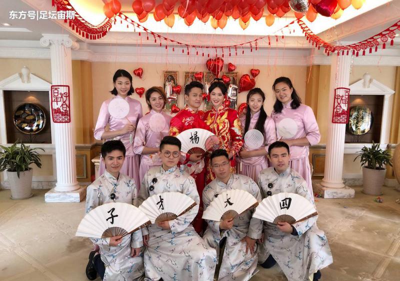 伴娘團成員婚禮現場身着一襲粉色禮服,手持中式扇,平日在賽場「霸氣」「兇狠」的她們經過一番打扮變得十分靚麗,着實吸引現場親友眼球。