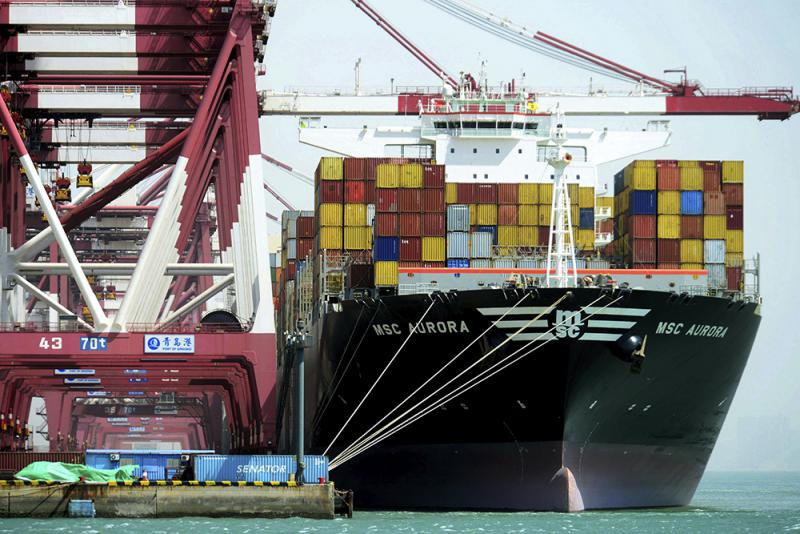 圖:一艘貨輪在青島港起卸貨物\資料圖片