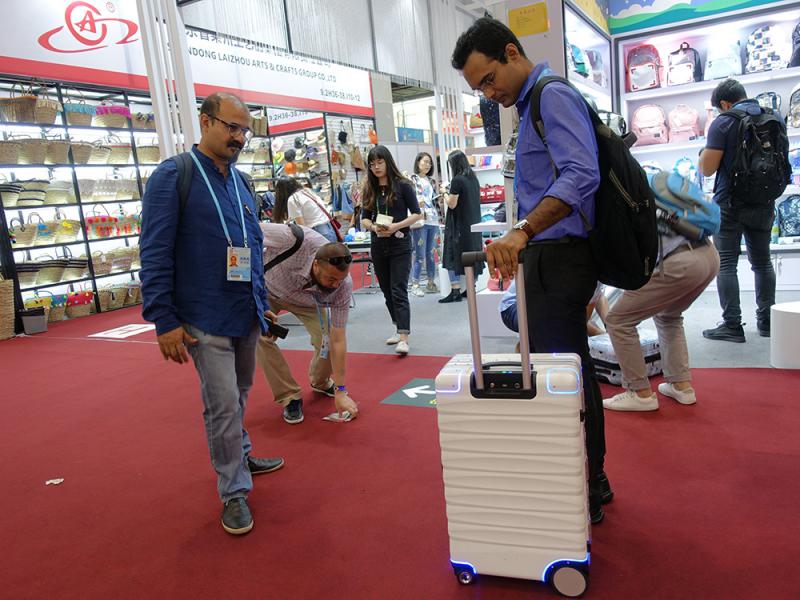 在箱包展館中的一個展位前,圍着一群海外採購商,他們舉起手機,交頭接耳,好不熱鬧。中央圍攏的是一個發着藍光的白色行李箱,工作人員在前面走,行李箱也在背後徐徐跟着走,整個過程彷彿被一根無形的線牽引一般。這個來自廈門建發股份有限公司工作人員告訴記者,這個行走的旅行箱在試驗階段,還沒正式上市,跟蹤行走功能正在開發中。目前跟蹤行走功能,通過藍牙技術和傳輸感應,可以人在前面走,背包跟蹤行走。「而且行李箱裏自帶電池,可以外出方便充電。」工作人員張汪陽告訴記者,行李箱除了自動跟蹤外,還可以用遙控器控制行走方向,同時還有防丟失、防盜功能,外出旅行可以更安心。