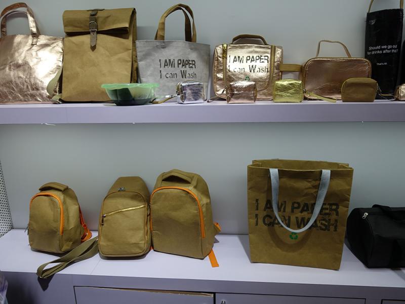 圖:這系列手袋和背包全是用可回收紙製作的並可水洗\大公報記者盧靜怡攝