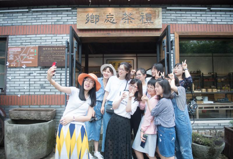 5月30日,遊客在浙江省德清縣莫干山鎮一家茶文化體驗店門口合影。2013年,當地將鎮上蠶種場遺留的廢棄廠房重新規劃,改造成包含文化展示、藝術公園、餐飲酒店在內的鄉村文創市集。目前,這裏已有23家文化創意企業入駐,成為返鄉創業青年和遊客聚集的文化場所。 (新華社)