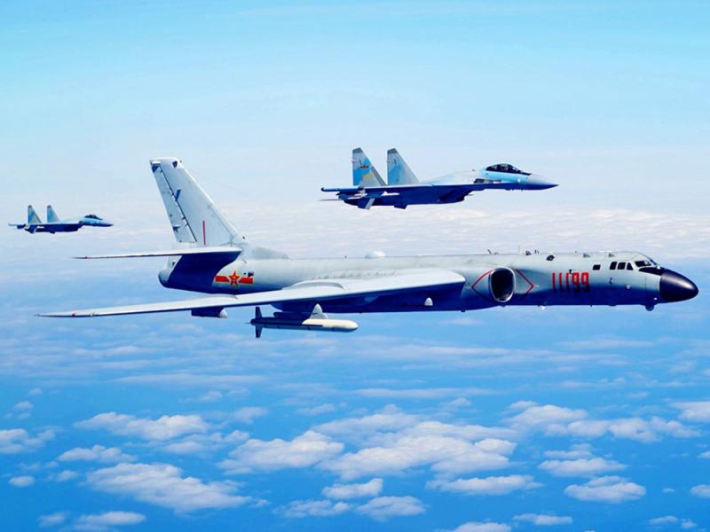 圖:解放軍兩架蘇-35戰機(後者)保護轟炸機繞島巡航\網絡圖片