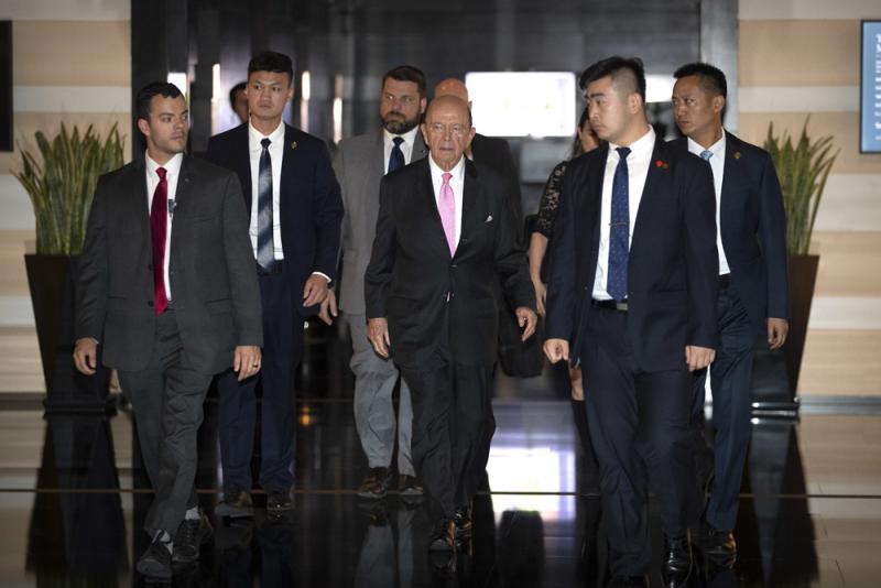 圖:美國商務部長羅斯(中)2日抵京,他離開下榻酒店時未有回應傳媒提問\美聯社
