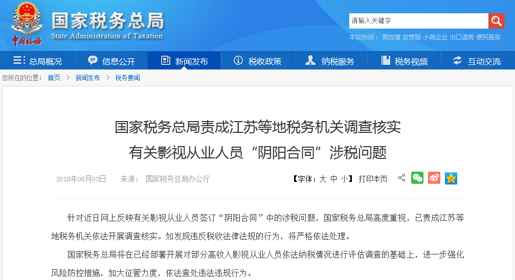 大公網6月3日訊 國家稅務總局辦公廳3日發布公告稱:針對近日網上反映有關影視從業人員簽訂「陰陽合同」中的涉稅問題,國家稅務總局高度重視,已責成江蘇等地稅務機關依法開展調查核實。如發現違反稅收法律法規的行為,將嚴格依法處理。