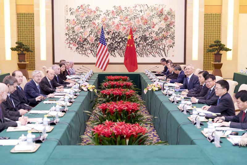 圖:國務院副總理劉鶴帶領中方團隊與美國商務部長羅斯帶領的美方團隊在釣魚台國賓館進行經貿磋商\新華社
