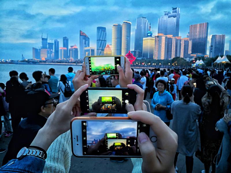 圖:上海合作組織青島峰會將於6月9日在青島開幕。夜幕下的青島燈光璀璨,以其迷人的夜色,迎接八方賓客。圖為遊客用手機拍攝浮山灣夜景\新華社