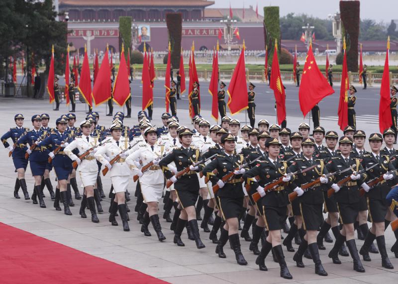 圖:改革後的國事訪問歡迎儀式6月6日首次啟用。圖為三軍儀仗隊首次增加女兵方陣\中新社