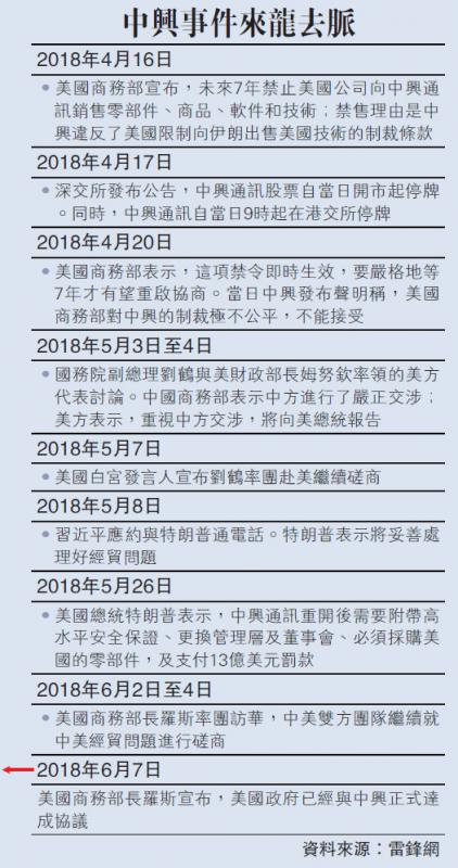 ︻大公報訊︼綜合新華社、央廣網報道:美國商務部長羅斯7日宣布與中國中興通訊公司達成新和解協議。美國商務部當天發表聲明說,羅斯當天宣布中興通訊及其關聯公司已同意支付罰款和採取合規措施來替代美國商務部此前針對該公司向美國供應商採購零部件執行的禁令。聲明指出,根據新的和解協議,中興公司支付10億美元罰款,另外準備4億美元交由第三方保管,然後美國商務部才會將中興公司從禁令名單中撤除。