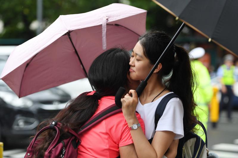 圖:深圳一名家長在雨中與出場的考生相擁\中新社