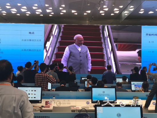 大公文匯傳媒全媒體記者楊奕霞、胡卧龍 青島報道:「有朋自遠方來」!上合青島峰會今日迎來與會嘉賓。當印度總理莫迪乘坐的飛機抵達青島國際機場時,新聞中心的印度記者紛紛將鏡頭對准直播大屏,熱情洋溢地進行播報。而此舉也令新聞中心的其他媒體記者興奮起來,用鏡頭記錄這一時刻。