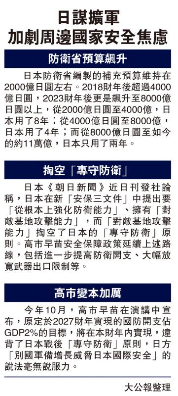 日本《朝日新聞》近日刊發社論稱,日本在新「安保三文件」中提出要「從根本上強化防衛能力」、擁有「對敵基地攻擊能力」,而「對敵基地攻擊能力」掏空了日本的「專守防衛」原則。高市早苗安全保障政策延續上述路線,包括進一步提高防衛開支、大幅放寬武器出口限制等。
