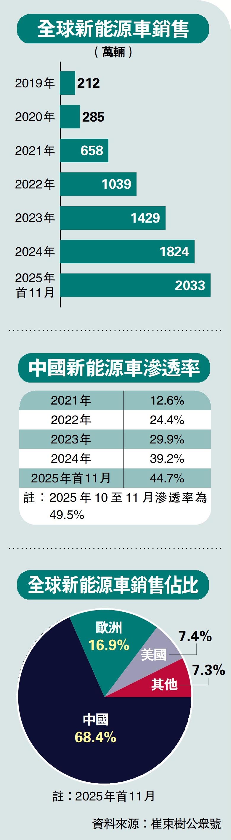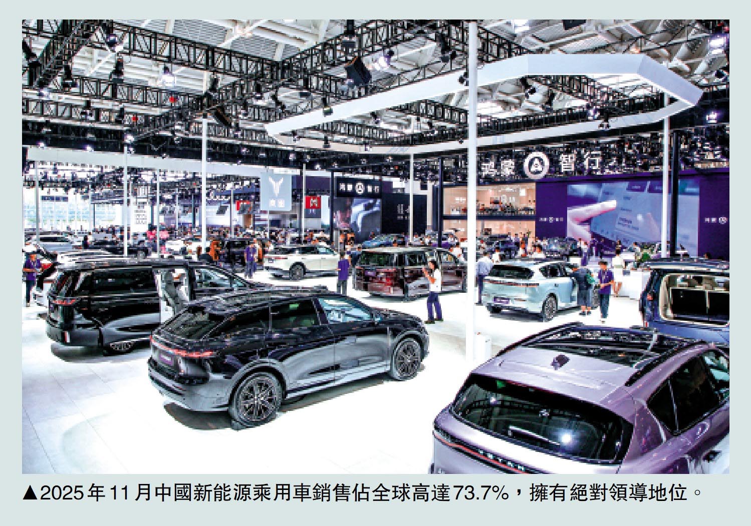 中國新能源車在全球市佔率持續高企。中國汽車流通協會乘用車市場信息聯席分會(乘聯分會)秘書長崔東樹表示,2025年首11月全球汽車銷量達8766萬輛,其中新能源車達2033萬輛,已較2024年全年增11.5%,佔比為23.2%。期內,中國新能源乘用車佔世界份額達68.4%,單計11月份更高達73.7%,可見中國新能源車在全球市場具絕對的領先地位。