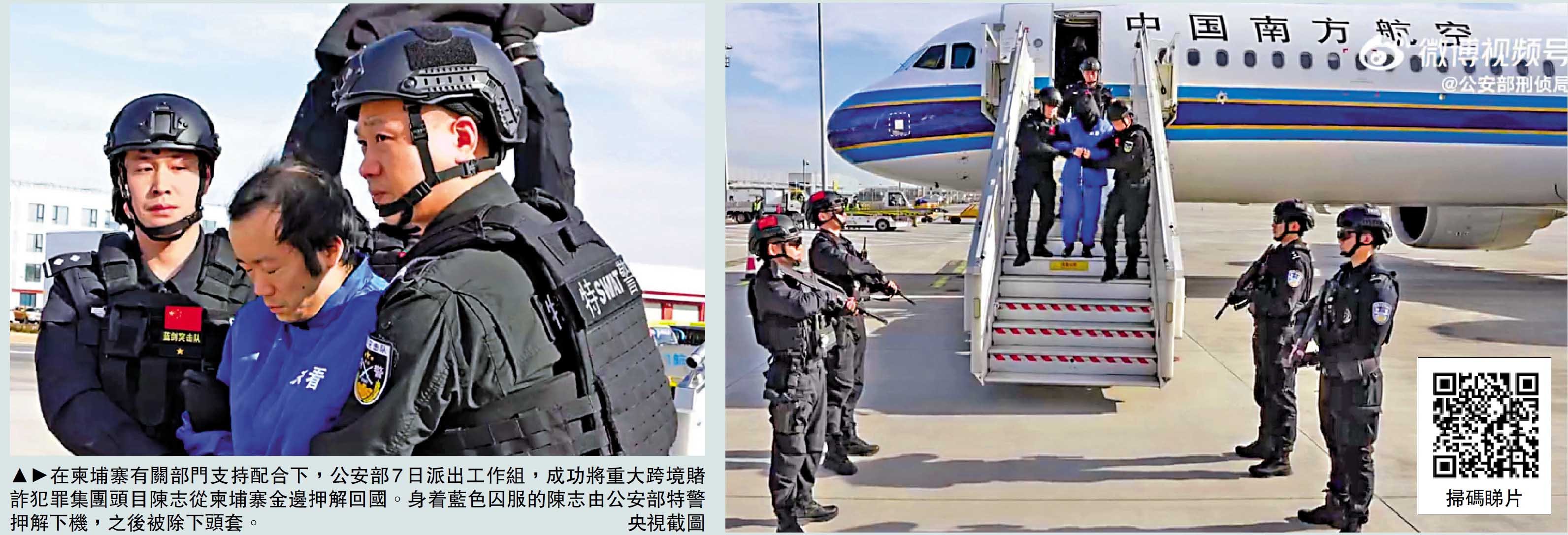 中柬執法合作取得又一重大戰果。公安部8日晚發布消息,在柬埔寨有關部門支持配合下,公安部派出工作組,於7日成功將重大跨境賭詐犯罪集團頭目陳志(中國籍)從柬埔寨金邊押解回國。據悉,公安機關將於近期公開通緝首批陳志犯罪集團骨幹成員,堅決將在逃人員緝捕歸案。公安部有關負責人表示,近期將公開通緝團夥骨幹,並正告犯罪分子,認清形勢、懸崖勒馬,立即投案自首,爭取寬大處理。