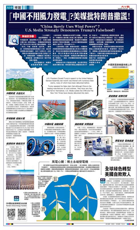 【大公報訊】據中通社報道:針對美國總統特朗普近日在瑞士達沃斯舉行的世界經濟論壇年會演講中稱「中國製造了很多風力渦輪機,但在中國卻找不到任何風力發電場」,中方22日表示,中國在應對氣候變化、推動全球可再生能源發展應用方面所作努力,有目共睹。去年7月4日,特朗普曾在聯大發表同樣的謬論,稱中國製造了很多風力發電設備,但自己卻「幾乎不使用風力發電」。
