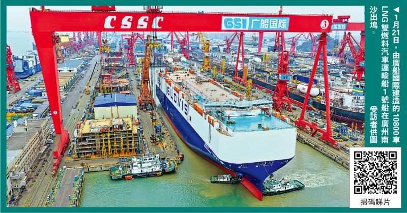 中國船舶旗下廣船國際22日通報,由廣船國際為韓國HMM公司建造的10800車LNG雙燃料汽車運輸船(PCTC)1號船21日在廣州南沙出塢。