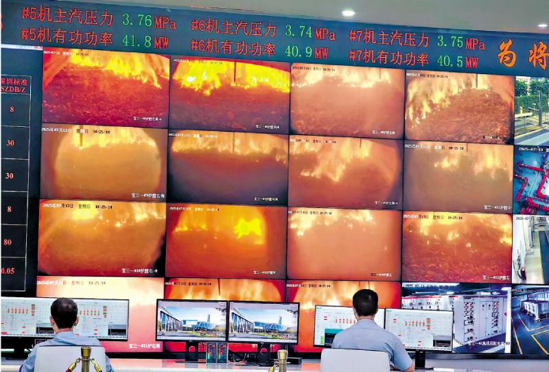 在深能環保寶安能源生態園中央控制室,電子屏幕上實時跳動着焚燒爐內溫度、煙氣排放等數據。垃圾吊控制室內,工作人員正透過玻璃幕牆遠程操控垃圾吊抓機械臂,在近25米深的巨型垃圾池上方精準抓取,將堆積如山的廢棄物投入千攝氏度高溫的焚燒爐中,再化作電能,整個廠區聞不到絲毫異味。這裏每日處置生活垃圾近1萬噸,年發電量約16億度,發電量可供100萬個家庭的年使用量。