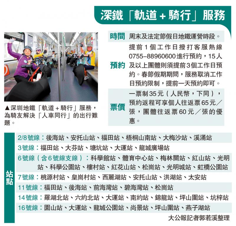 為助力深圳打造「山海連城 騎樂無窮」的騎行品牌,進一步滿足市民出行和休閒健身的多元需求,2月15日起,深圳地鐵將新增28個「軌道+騎行」服務站點,於周末及法定節假日為乘客提供騎行友好服務。隨着深港融合不斷深化,這項服務也成為港人北上休閒的新選擇,讓更多香港同胞便捷感受深圳的山海風光與新春氛圍。