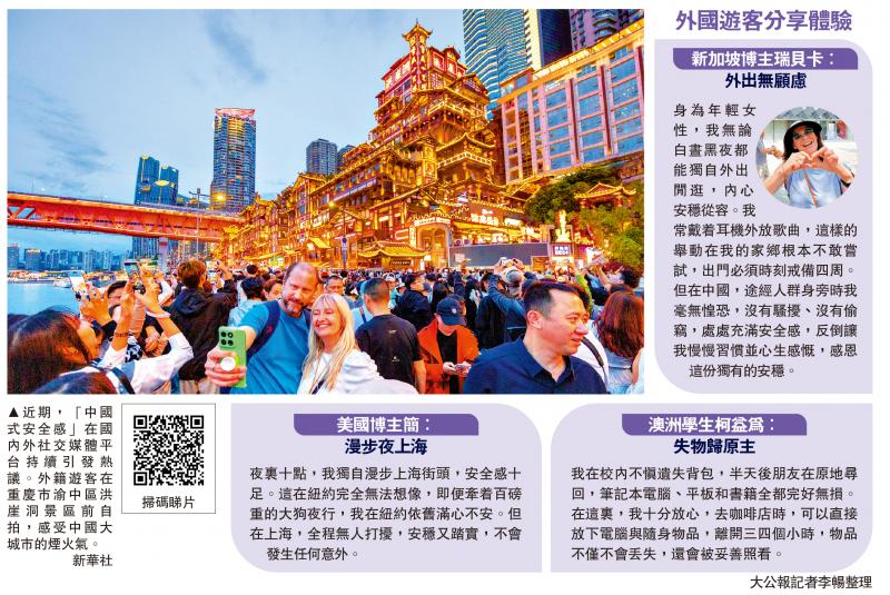 「中國式安全感」正成為一張亮眼的國家名片,在海外社交平台持續刷屏。「在中國,夜晚出門唯一的『危險』,就是有太多美食,會讓錢包變瘦、人變胖。」一位加拿大博主的調侃,道出了無數外國人對中國深夜安全的嚮往。\大公報記者 李暢北京報道
