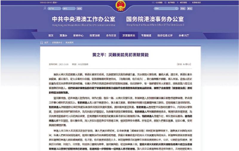 【大公報訊】中央港澳工作辦公室、國務院港澳事務辦公室,11月30日在網站轉載《大公報》題為《龔之平:災難面前見初衷驗賢能》的評論文章。
