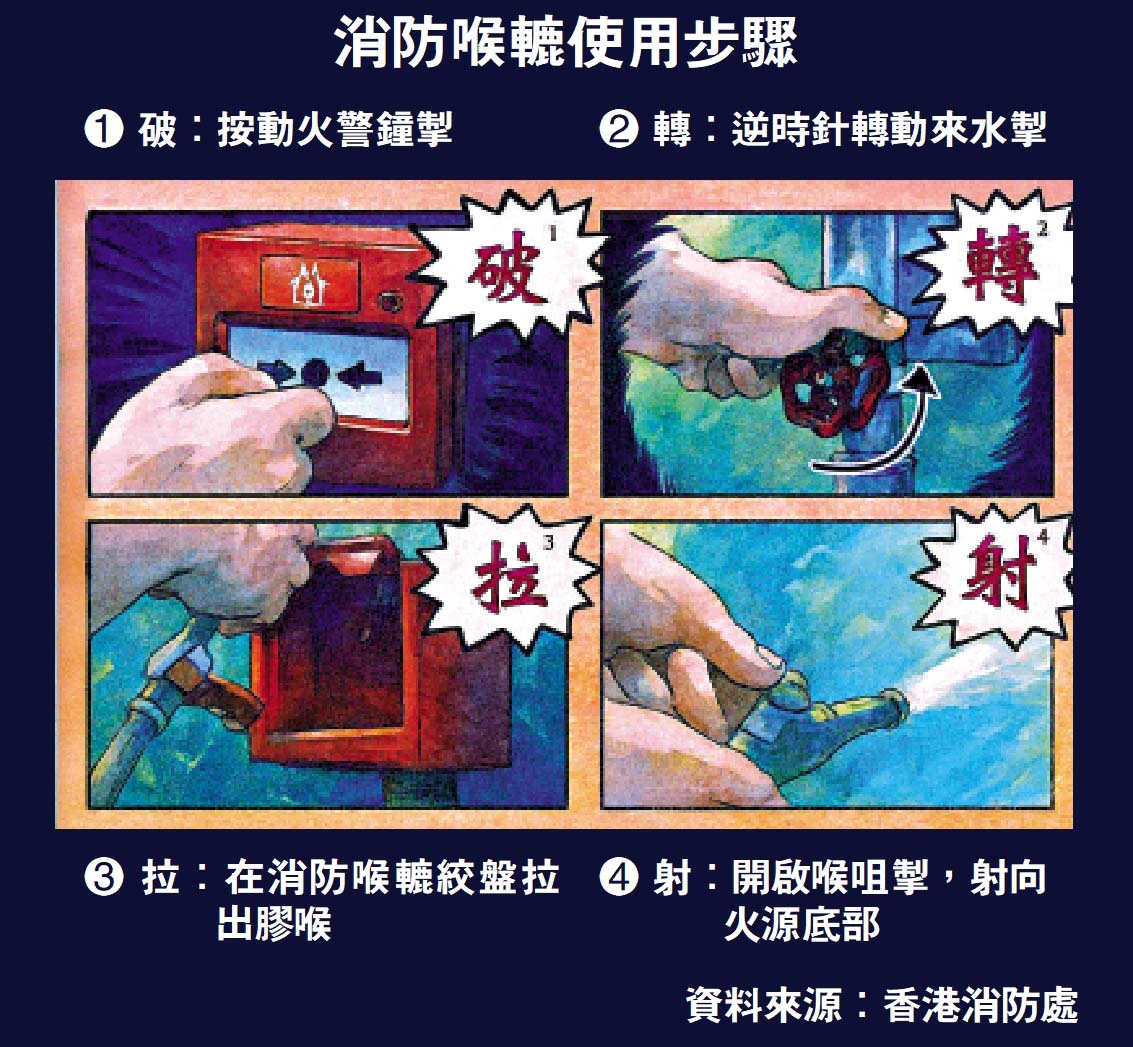 消防顧問梁錦得表示,在發生火警時,須先將手動火警鐘掣的玻璃打破,火警鐘才會響起,從而啟動水泵泵水,且喉轆亦存在兩個水掣,須先扭開主水掣,將消防喉拖到起火單位後再開喉掣射水。但普通市民很多時候會因為慌張而忘記開主水掣,導致消防喉看似無水。他認為本港對市民的消防訓練極少,缺乏實際操作經驗,建議考慮在學校層面加強消防教育。