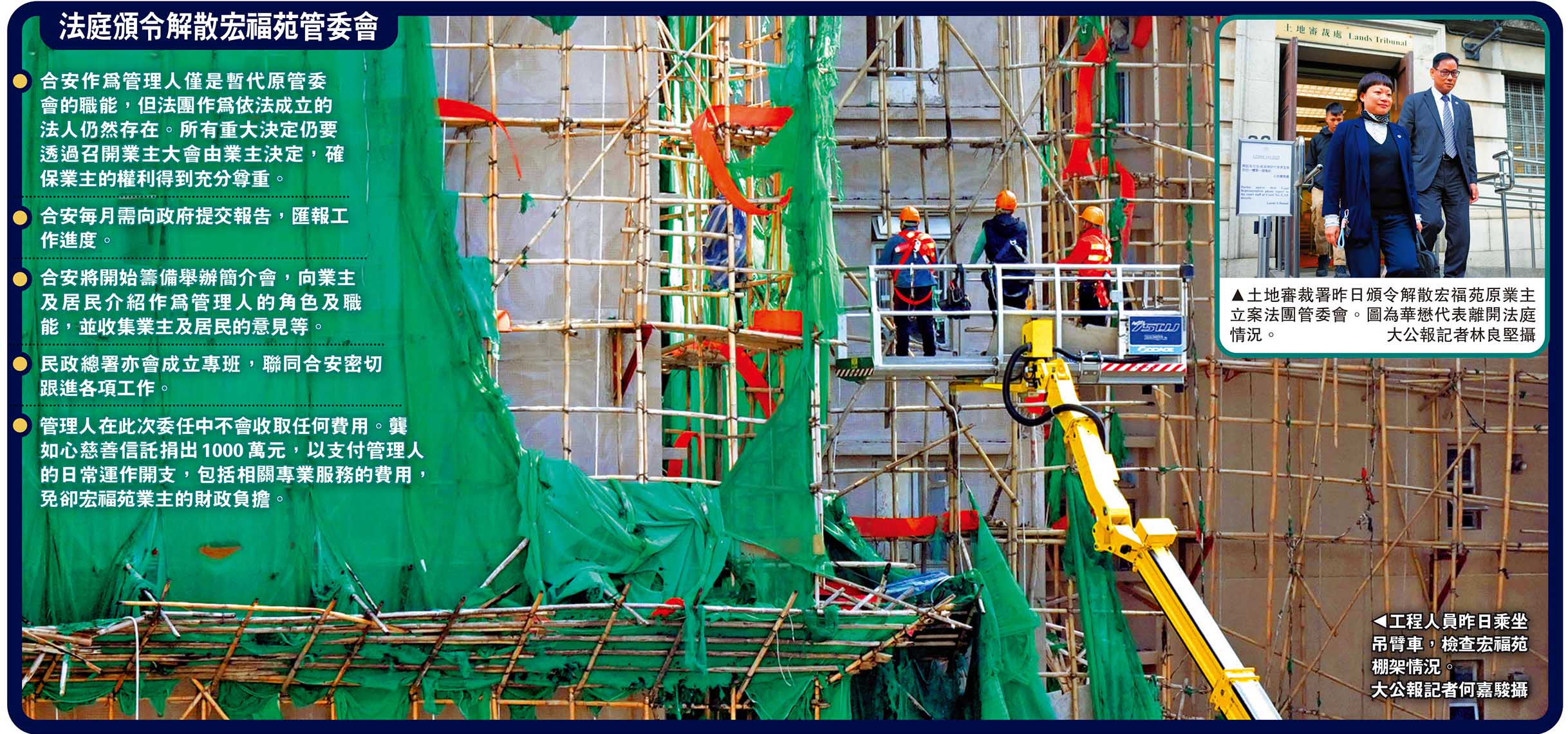 大埔宏福苑大火奪去161人性命,政府首次援引《建築物管理條例》,申請解散宏福苑業主立案法團管委會,委任華懋集團旗下的合安管理有限公司作為屋苑管理人,土地審裁處昨日批準有關申請,頒令「合安」以無償方式擔任管理人,不設限期,每月需向政府提交報告。