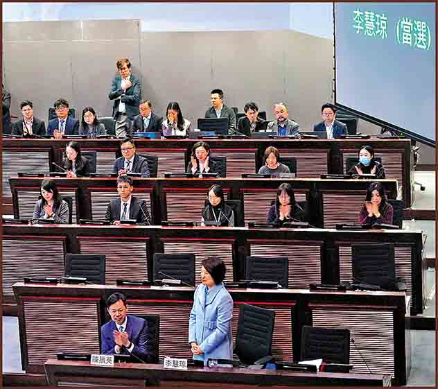 第八屆立法會議員已於元旦宣誓就職,立法會主席選舉昨日舉行。全國人大常委會委員、九龍中議員李慧瓊與港區全國人大代表、金融界議員陳振英二人競逐主席,共有89名議員出席會議及參與投票。李慧瓊以47票當選第八屆立法會主席,陳振英則取得42票。