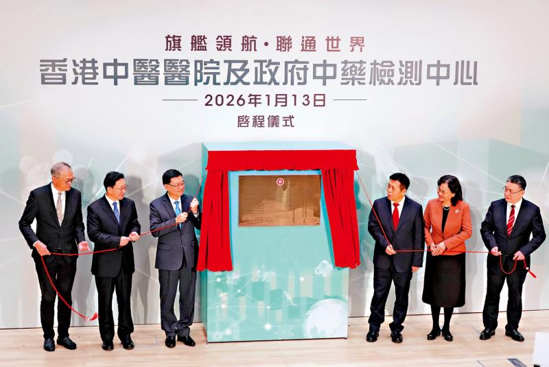 李家超指出,國家高度重視中醫藥傳承、創新與發展,「十五五」規劃建議明確提出推進中醫藥傳承創新、促進中西醫結合。特區政府積極配合國家戰略,融入並服務國家中醫藥發展大局。上月公布的香港首份《中醫藥發展藍圖》以傳承中醫智慧、提升市民健康為願景,香港中醫醫院與政府中藥檢測中心作為兩大旗艦機構,將配合藍圖,帶動中醫藥服務、人才培訓與產業科研等領域協同前行。