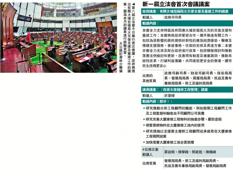 今日是本屆立法會會期首次會議,政府提出首份議案。該份由政務司司長動議的政府議案提出:本會全力支持特區政府因應大埔宏福苑火災的災後支援和重建工作;本會將與政府緊密合作,攜手推進有關工作,包括為受影響的居民提供針對性的應急經濟援助、醫療及情緒支援服務、善後事務、住宿的安排及長遠方案;本會亦會全力支持及配合政府進行改革,包括積極探討和推動落實法例檢討和更新,改善現有制度及堵塞漏洞,推動系統性改革,打破利益藩籬,共同建設更安全的香港,讓市民生活得更安心。