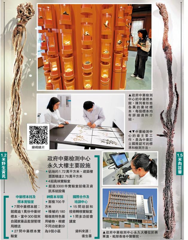 政府中藥檢測中心致力建立國際認可的中藥參考標準及檢測方法,推動香港成為中醫藥走向世界的「橋頭堡」。檢測中心設有中藥標本館,館內收藏超過一萬份藥材標本,可在制定香港中藥材標準過程中,作為品種鑒別和對照的實物依據,當中包括國家贈送的300份珍稀名貴標本,例如長約1.2米的巨型野生黃芪、1.5米的肉蓯蓉標本等。檢測中心內亦設有神農本草園,種植約180種藥用植物,連同草藥標本及中成藥製作過程,可為公眾展示中藥的「全生命周期」。\大公報記者 王亞毛(文) 林良堅(圖)