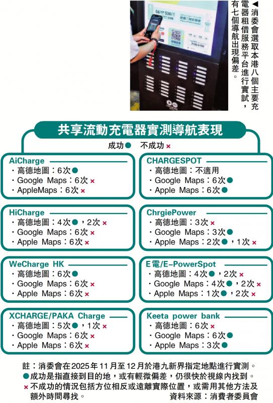 【大公報訊】記者黃佩琳報道:近年來,流動充電器租借服務興起,但部分服務不完善為出行造成困擾。消費者委員會選取本港8個主要租借服務平台進行實試,有7個平台導航出現偏差,如路線相反、起點錯誤。此外,更有收費標識不清、站點營業時間不符等問題。消委會促業界改善站點資料地圖整合、提升收費透明度,並建議消費者事先了解、比較信息。