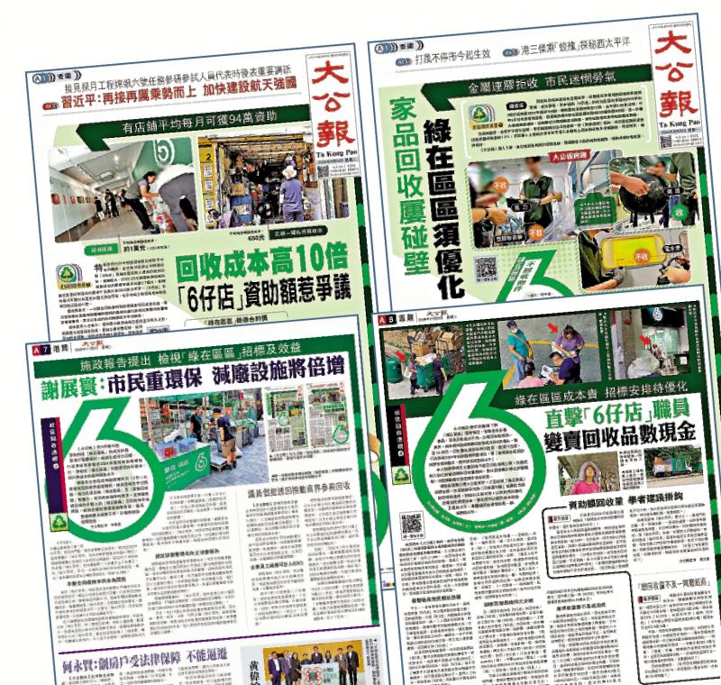 【大公報訊】記者陳杰報道:針對社區回收,特別是「綠在區區」的問題,《大公報》早在2024年已推出「社區回收透視」系列報道,當中揭示了「綠在區區」的回收量與成本問題、私營回收小店經營困境,以及探討政府回收政策的不足,其核心在於反映香港回收系統在推行中遇到的挑戰與改善空間,包括回收指標不夠合理、回收成本高昂、需引入更多支援等問題,以推動整體回收網絡優化。