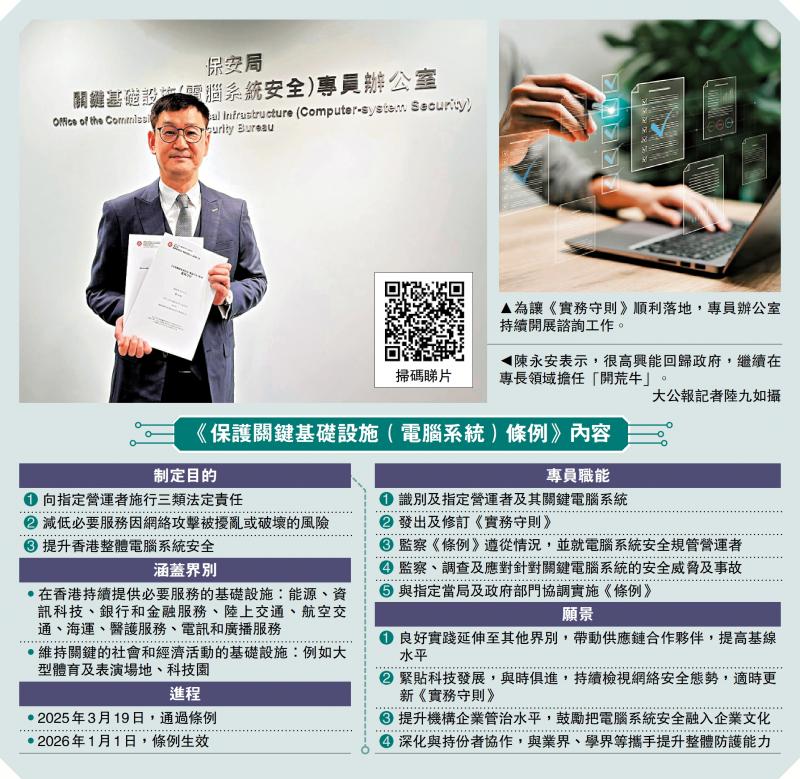 「我們希望讓所有關鍵基礎設施的營運者,都能形成重視電腦系統安全的企業文化。」陳永安日前接受《大公報》訪問時表示,制定《條例》的主要目的是向關鍵基礎設施的營運者施加法定責任,以確保他們採取措施保護電腦系統安全,並維持香港社會的正常運作和市民的正常生活。專員辦公室已制定包含逾200項指引的《實務守則》。\大公報記者 陸九如