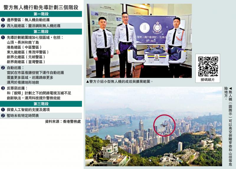 警方將於1月23日啟動「小型無人機行動調配」先導計劃第二階段,無人機自動巡邏範圍除了原有邊界警區,將新增山頂、長洲和南丫島,原有只在西九龍總區進行的反罪惡巡邏,將拓展至中區警區、秀茂坪警區、元朗警區及荃灣警區,具體應用包括緊急救援,同時具備覆蓋盲點、快速評估、用於人流管理的效能,未來會採用「先聚焦、再擴散」的方式,逐步推進至更大範圍。\大公報記者 陳泓源