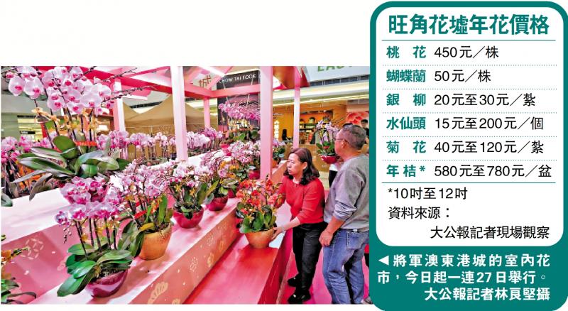 【大公報訊】記者肖泓宇報道:臨近歲晚,年花爭相鬥艷迎新春。大公報記者昨日實地走訪旺角花墟及商場內的花市,了解到花卉價格與去年相若,不少市民提前到花市物色年花,有市民預計花費1000元購買蘭花及水仙。有花商表示,過去一年香港經歷挑戰,預計市民希望透過買年花帶好兆頭回家,估計年花銷量可望上升約兩成。今年氣溫較高,花商提醒桃花或提早盛開。