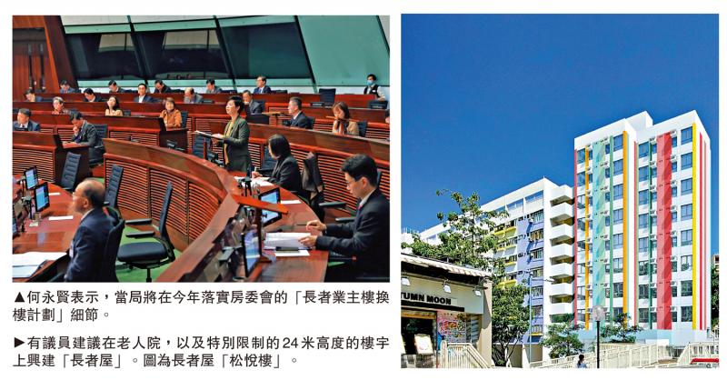 何永賢表示,不少議員建議興建長者公寓、長者社區,為提供長者住宿單位,提供集居住、康樂設施與醫療護理於一身的居所,房協正就此進行探討;或將居家安老設計融入更多住宅項目,如大廈管理、財務安排等方面不同模式,以此為私人市場提供更多選擇,並帶動私人市場思考。