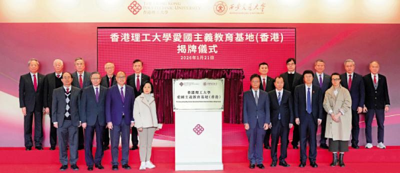 為增強愛國主義教育,香港理工大學與西安交通大學(西安交大)昨日舉行「理大愛國主義教育基地(香港)」(基地)揭牌儀式,理大成為香港首間同時於香港及中國內地設立有關示範基地的大學。民政及青年事務局局長麥美娟、外交部駐港特派員公署新聞及公共關係部主任黃景睿、中央政府駐港國家安全公署處長曹奇峰等出席活動。