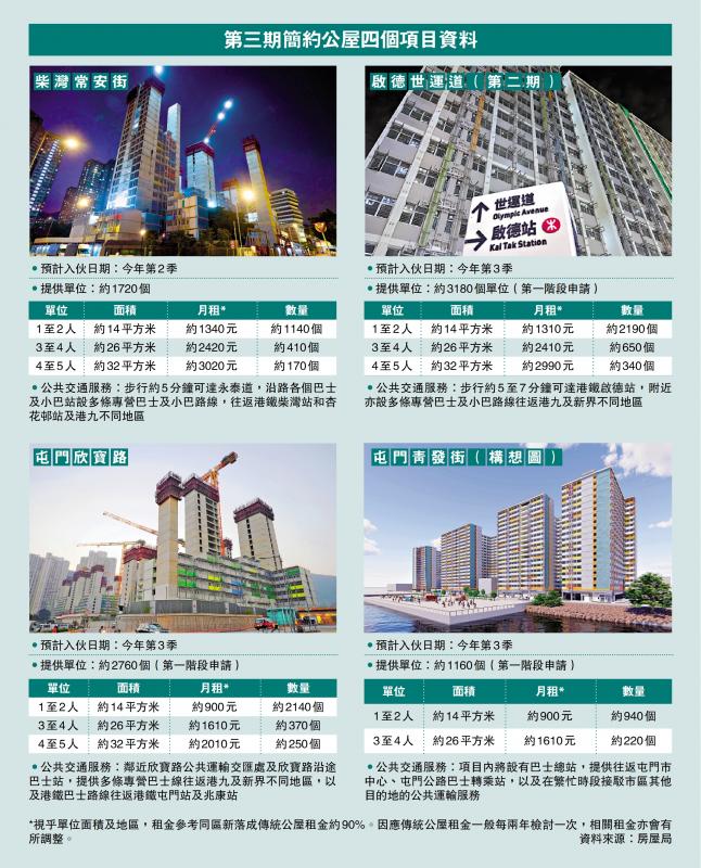 發言人表示,第三期簡約公屋各有優點,相信能切合不同申請者的需要。各項目的居住環境及配套設施,均遠較劣質劏房等不適切居所優勝,還有住戶特別津貼及營運機構為住戶提供的各種服務和支援。符合資格的人士會於本月30日或之前,陸續收到由房屋局寄出的申請表。