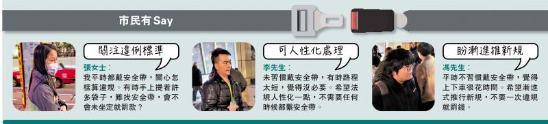 李先生:未習慣戴安全帶,有時路程太短,覺得沒必要。希望法規人性化一點,不需要任何時候都繫安全帶。