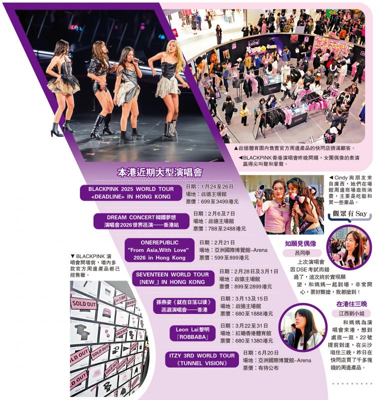 演唱會經濟對推動城市旅遊大有幫助,跨城追星已成為年輕人熱潮。韓國人氣天團BLACKPINK展開世界巡迴演唱,在香港的演唱會昨日開鑼,一連三日在啟德體育園主場館舉行,各地歌迷蜂擁而至,向偶像女團「朝聖」。