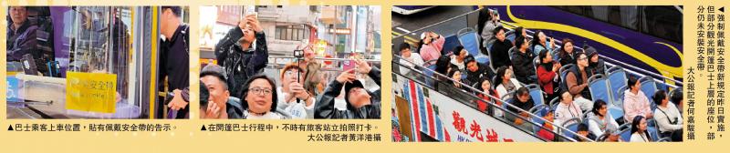 大公報記者昨日走訪尖沙咀星光大道、中環,發現觀光巴士站附近有工作人員舉牌提醒乘客佩戴安全帶,不少乘坐過、或計劃乘坐巴士的旅客認為相關宣傳足夠,認同安全帶新規能保障乘客安全。部分不清楚相關法例已實施的乘客,在記者的解釋下,亦表示會佩戴好安全帶乘坐巴士。