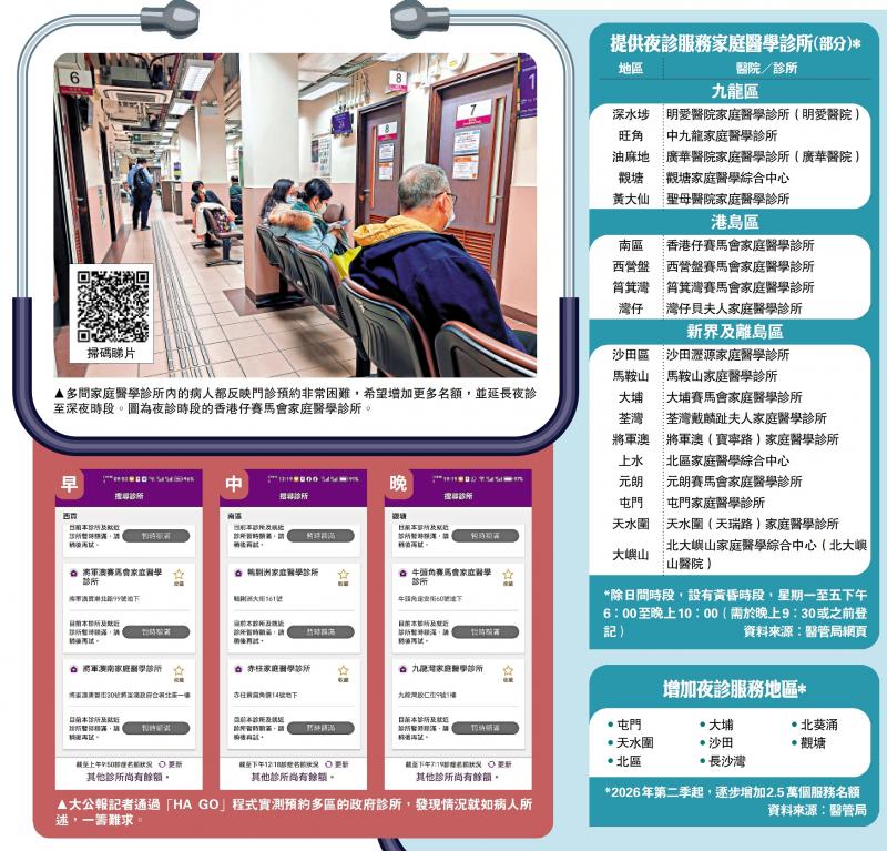 私營診所及醫院夜間門診服務收費昂貴,公立診所至晚上10時已停止服務,基層市民在夜間或假日患病時,往往被迫湧到公立醫院急症室。大公報記者多個晚上走訪醫管局轄下多間家庭醫學診所,不少病人反映預約非常困難,希望政府增加資源,開放更多名額,延長夜診至深晚時段。