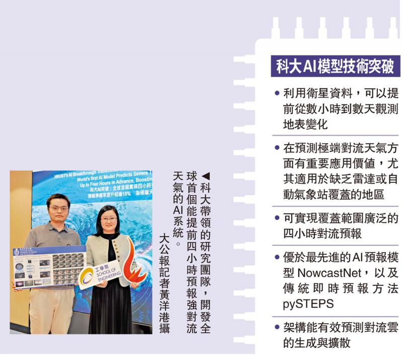 【大公報訊】記者王蕙如報道:全球暖化令極端天氣近年愈發頻密。本港去年夏季曾在八日內四度發出黑色暴雨警告,2023年發生的「世紀黑雨」更令全港多區嚴重水浸。由香港科技大學帶領的團隊,研發出全球首個能提前四小時預報強對流天氣(如雷暴及暴雨)的AI系統,相比現有模型僅提前20分鐘至兩小時,有較多時間予政府應對。預報準確度亦較現行模型提升逾15%,團隊透露,正與本港天文台商討合作應用。