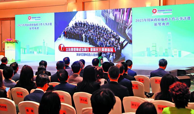 李大宏致辭表示,「2025特區政府施政十件大事」評選結果涵蓋政治、經濟、民生及大灣區融合等多個關鍵領域,充分映照出過去一年來,李家超帶領特別行政區政府推動社會各項事業的發展:從第八屆立法會換屆選舉圓滿成功舉行,到北部都會區建設破局提速推進;從粵港澳攜手承辦全運會與殘特奧會、啟動盛事經濟,到宏福苑大火善後工作高效處置、厚植民生底色,特區政府展現出的良政善治新風貌、新作為,得到社會各界和廣大市民的積極擁護與充分肯定。
