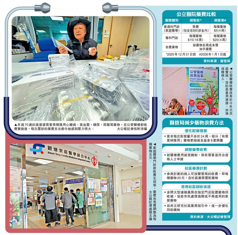 公立醫院新收費推行至今近一個月,專科門診藥費從以往16周收費一次、每種藥15元,新制改為每四周收20元,即16周收費80元,較舊收費增加逾四倍。有長期病患長者表示,每個月要看兩次普通科門診,直言每個月要多支付數百元醫療開支是壓力重大,「一年下來多幾千,一般退休人士扛不住的。」她期望政府能夠為此類人士提供更多幫助,例如主動幫助病人申請資助金。