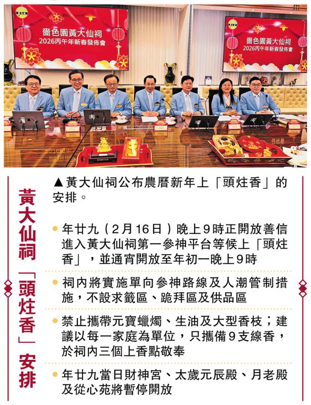 黃大仙祠上頭炷香是不少市民迎接大年初一的重頭節目,黃大仙祠昨日公布農曆新年上「頭炷香」,在大除夕年廿九(2月16日)晚上9時起,開放給市民入祠,等候於子夜上「頭炷香」。黃大仙祠會通宵開放至年初一晚上9時。